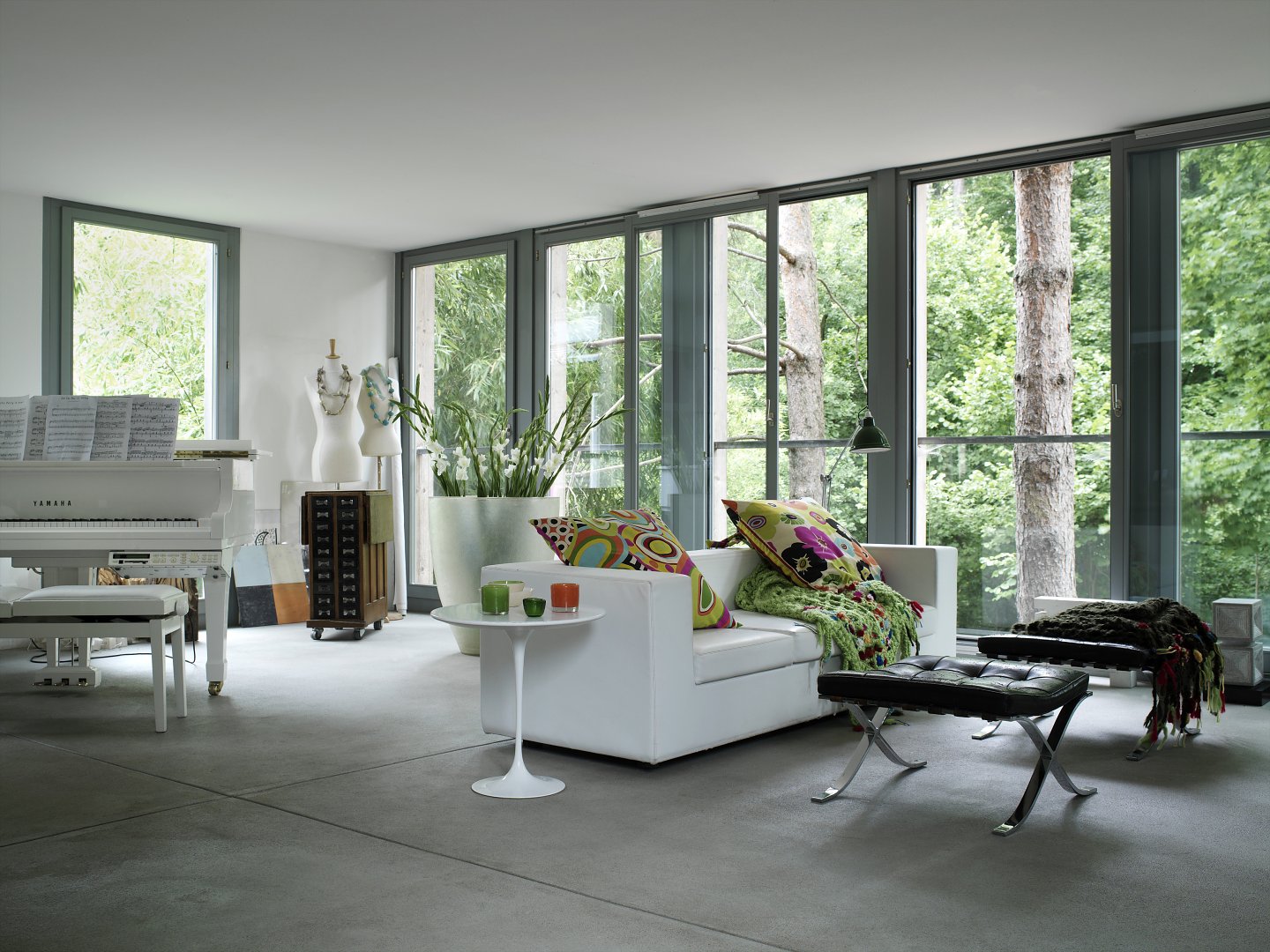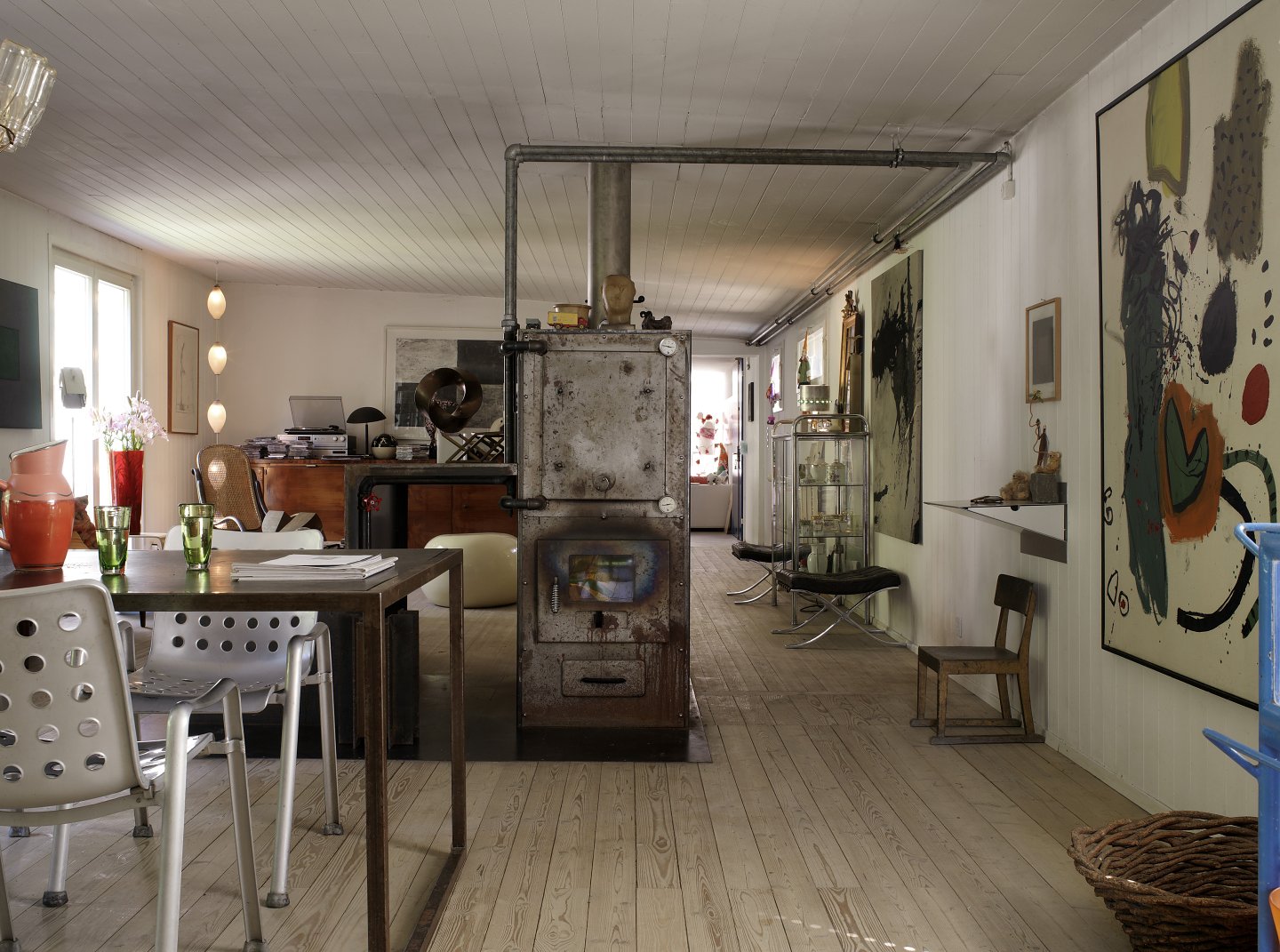 Mit minimalen Mitteln wird die Wirkung des Provisorischen lebendig erhalten. Aus dem Atelierhaus geht der Blick in die Baumwipfel des nahen Waldes. Im Sockel ist der Stall für die Pferde.