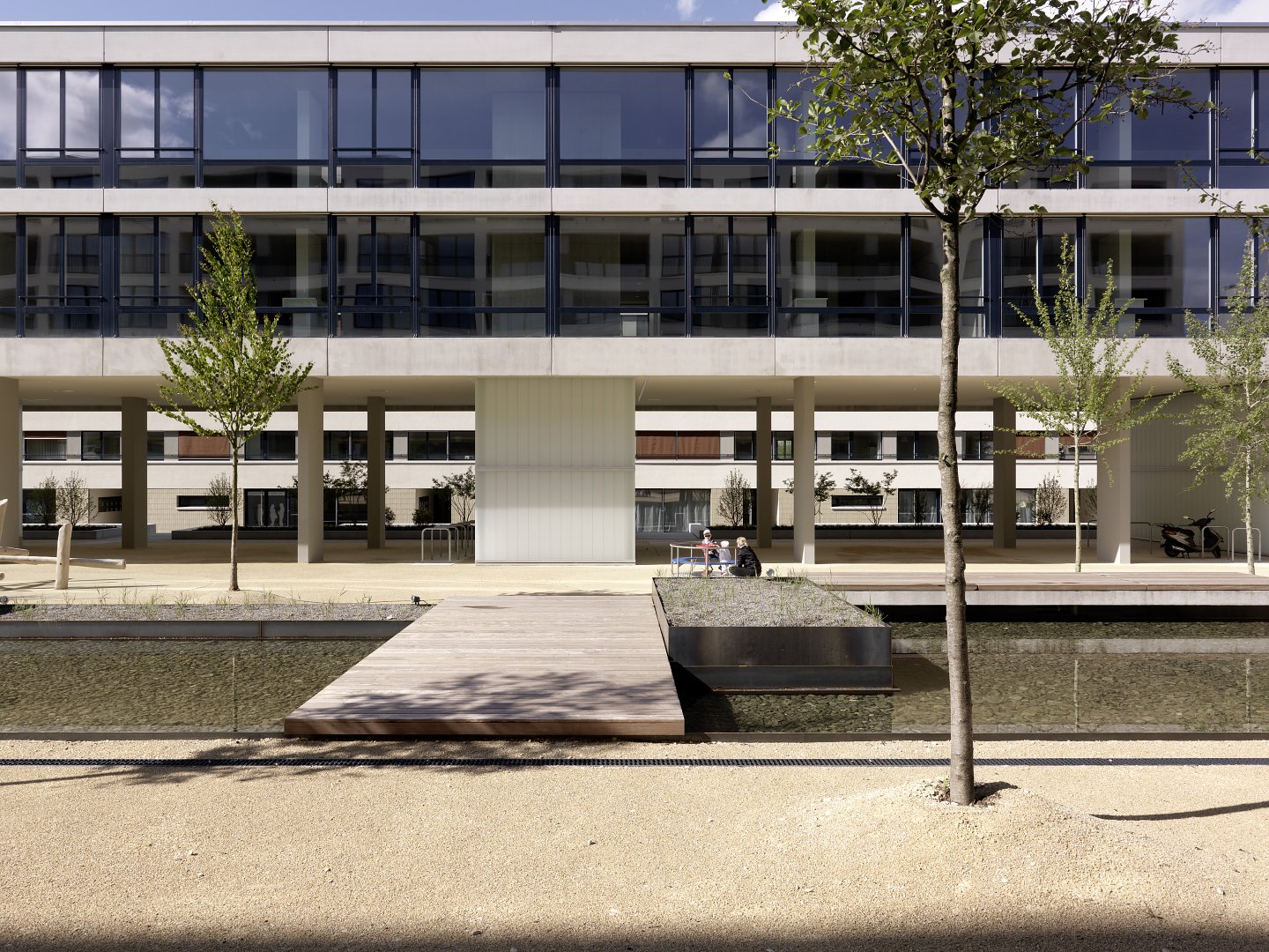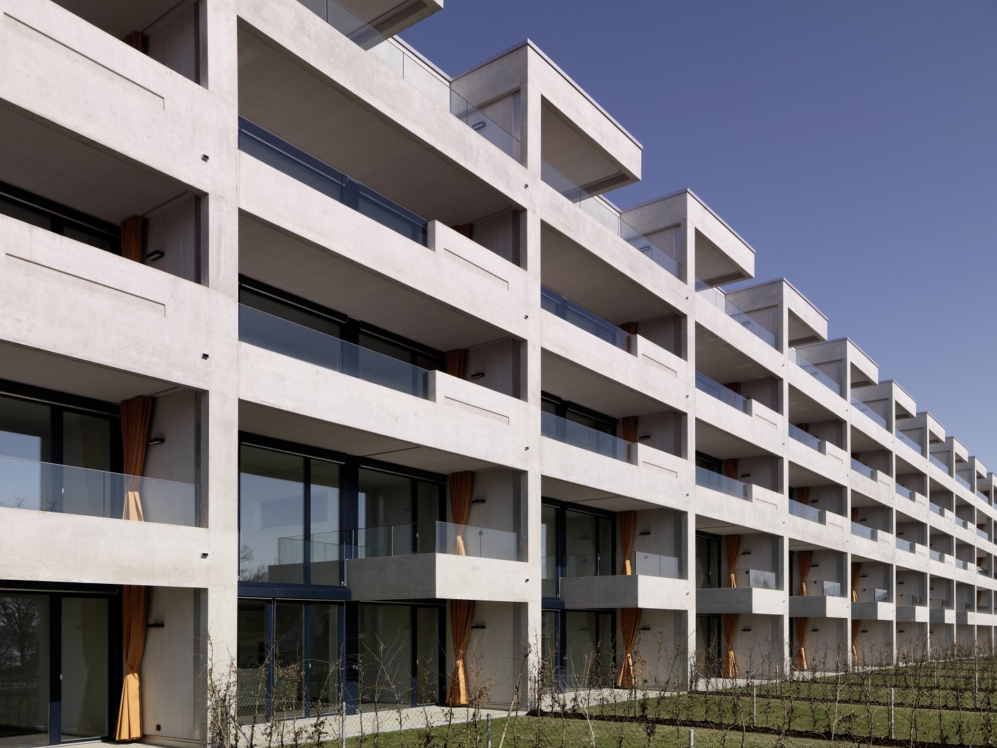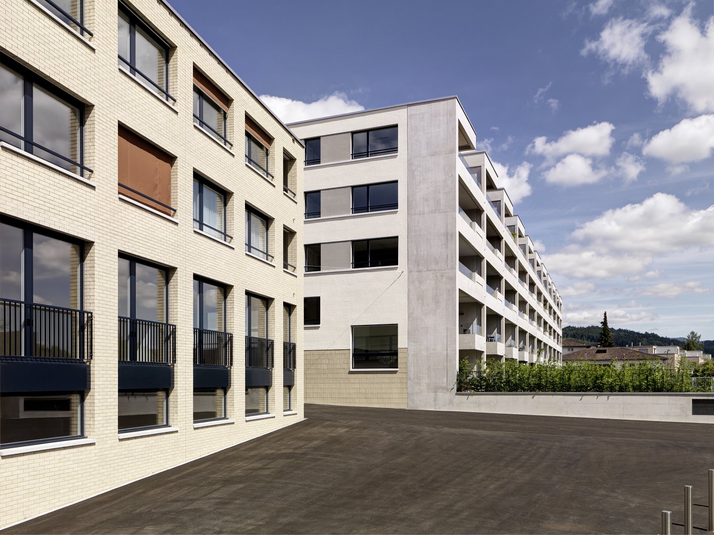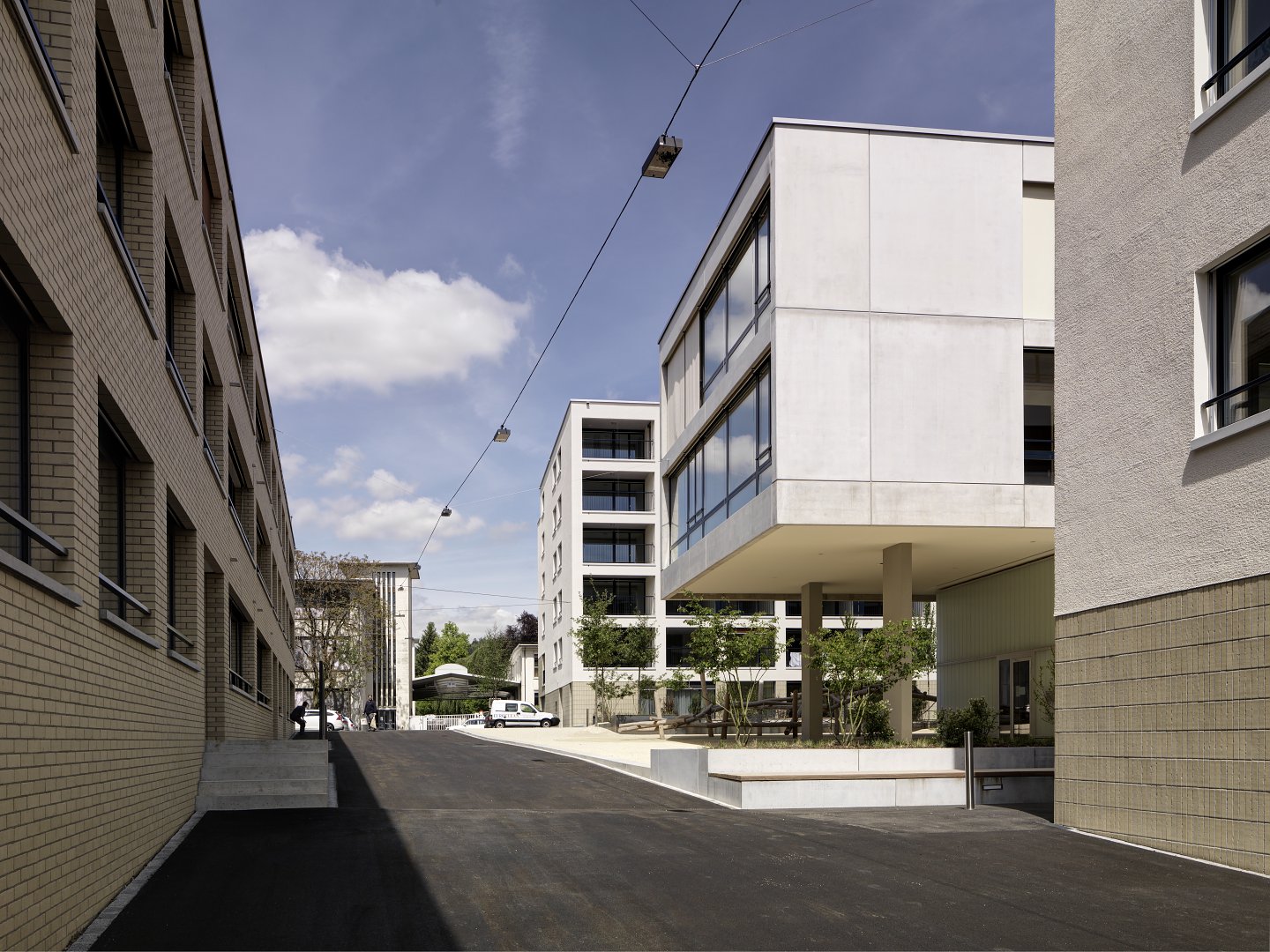 Das Ensemble hat eine differenzierte Materialisierung erhalten, in deren Vordergrund die Wohnqualität steht: Wohnlichkeit, Geborgenheit und Alltagstauglichkeit sind Zielwerte für den typologischen Charakter.