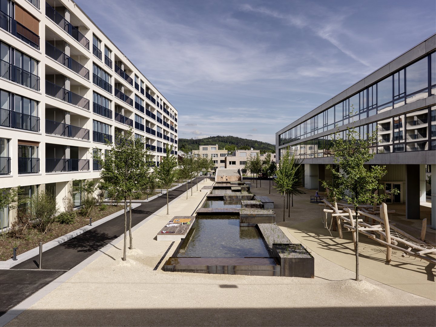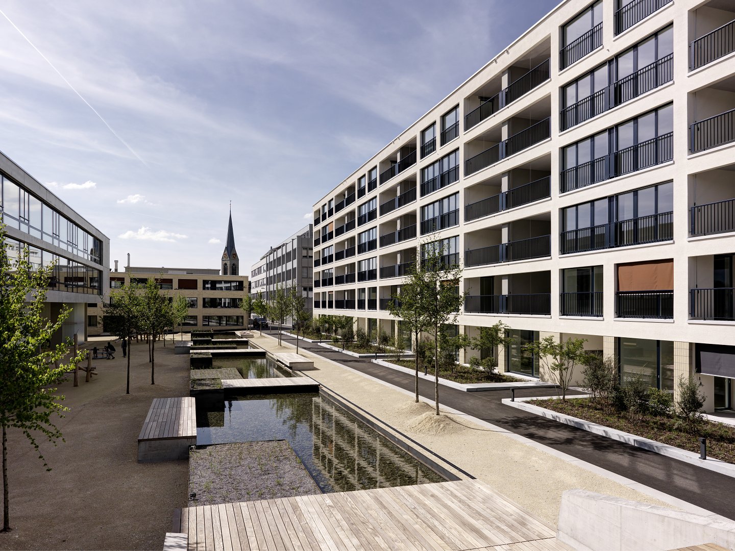 Auf dem Baufeld C im Huber & Suhner Areal in Pfäffikon wurden die Fertigungshallen der industriellen Produktion ersetzt. Innerhalb des privaten Gestaltungsplans sind in den Fussstapfen des Bestandes grossmassstäbliche Wohnbauten entstanden. 145 Wohnungen, Lofts und 1500 m² Gewerbefläche sind um eine Hofgestaltung mit grosszügigem Wasserbecken angeordnet. Es ist ein Ort in und für Pfäffikon mit starker, einzigartiger Identität entstanden, wobei der Wert und der Charme des Bestandes in der neuen Überbauung weiter erlebbar bleibt.