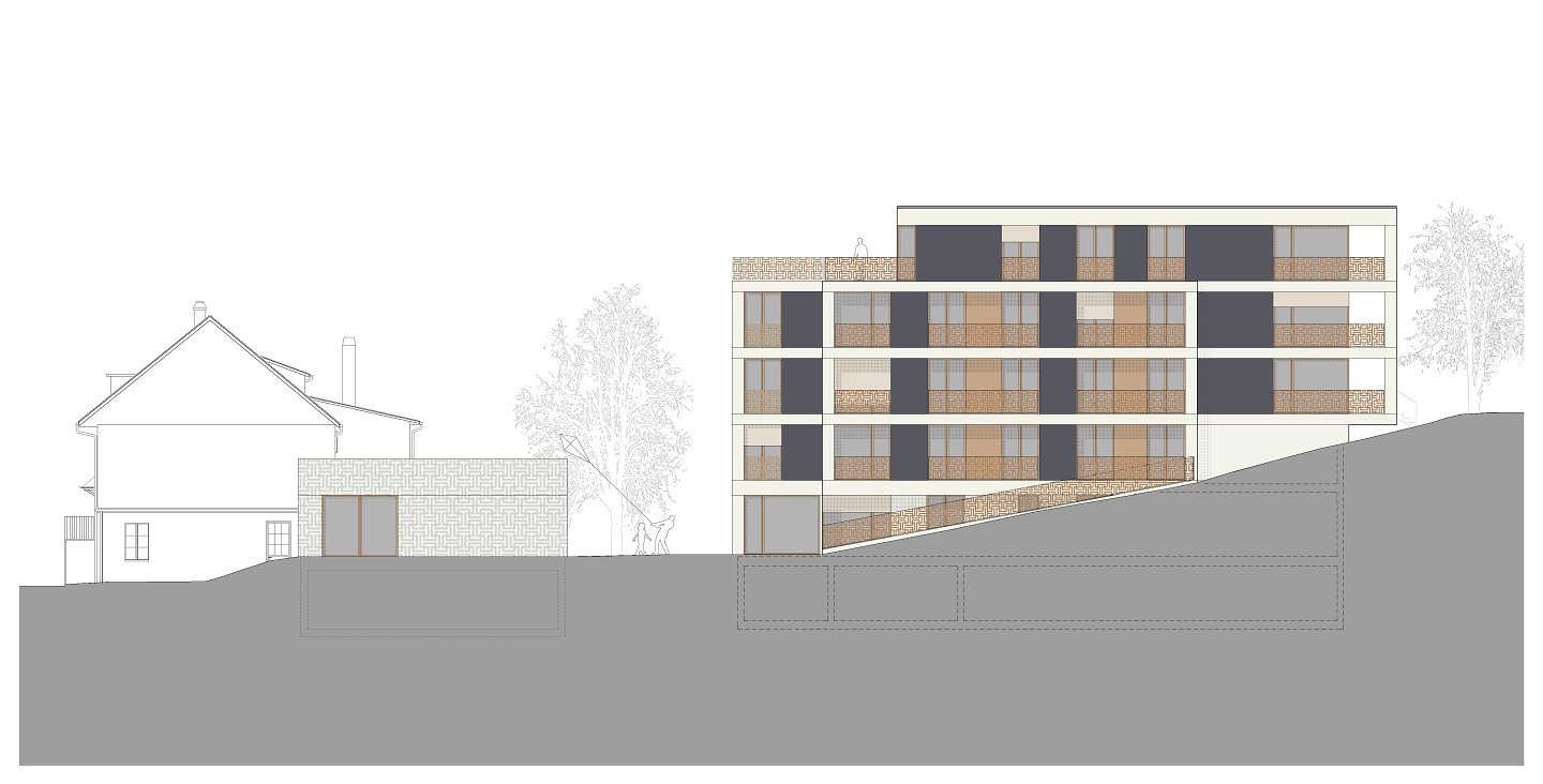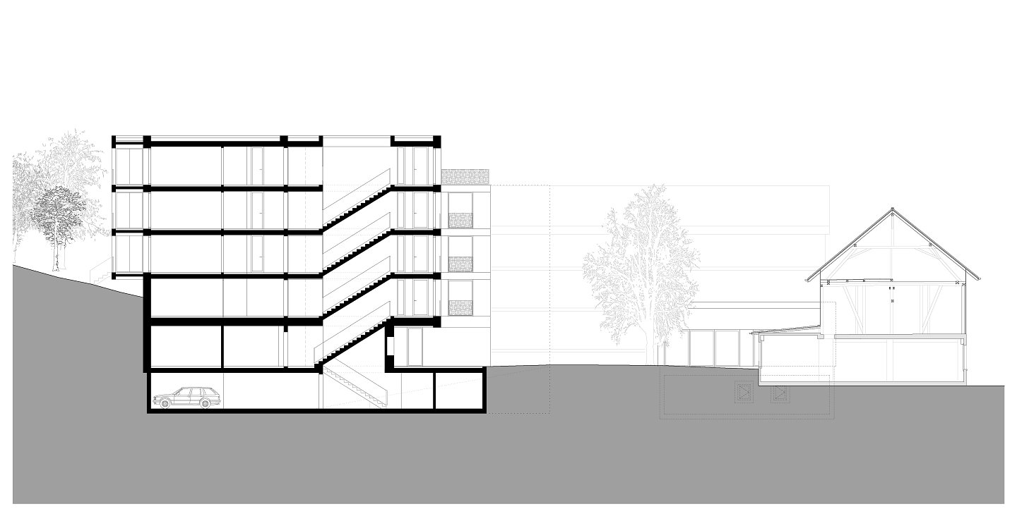 Das neue Mehrfamilienhaus spannt, zusammen mit dem benachbarten Bauernhaus und dem Gemeinschaftspavillon, ein Ensemble mit einem grosszügig gestalteten Aussenraum mit grossem Nussbaum für die Bewohner auf.