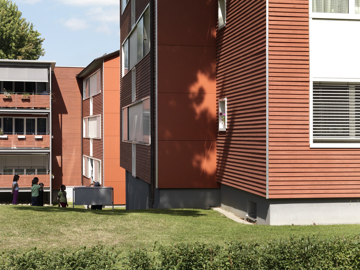 Die Fassaden in rot gebeizter, sägeroher Stülpschalung in Lärche schaffen den sinnlichen Rahmen für ein gemeinschaftliches Wohnen an exponierter Lage.