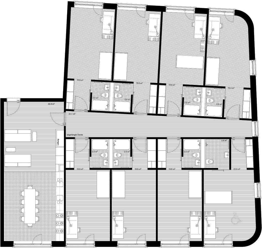 wohngemeinschaften und studios für 480 studenten, ateliers, gemeinschaftsräume, waschsalon, bar, praxen